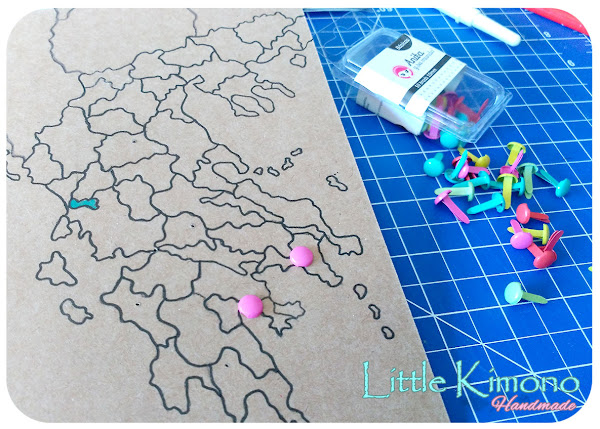 3. Marcamos los puntos visitados y colocamos brads de colores (los míos son de Anita y su mundo, también los podéis encontrar en Amazon).