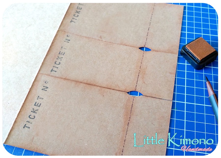 10. En el lateral izquierdo con los sellos estampamos "ticket nº" pegamos la entrada y en el lateral derecho con la Dymo el nombre del sitio.