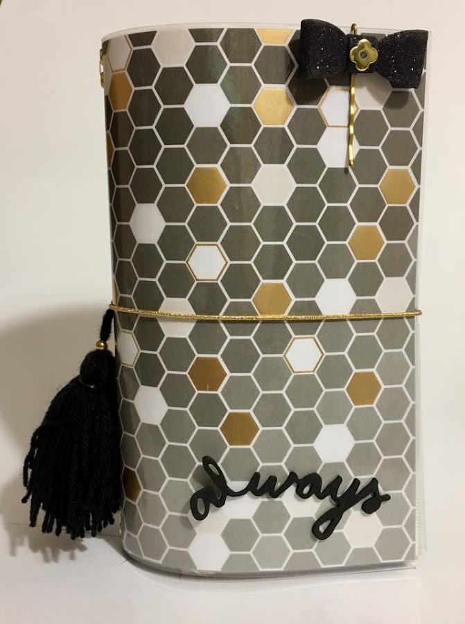 la portada que he plastificado he colocado un tassel que he hecho con lana, una palabra de foam de Ami Tangerine, y un lazo cortado con un troquel de Florileges que lo he pegado en una horquilla de pelo dorada.