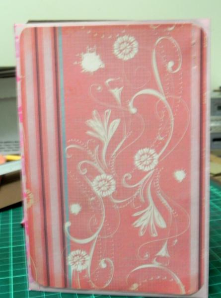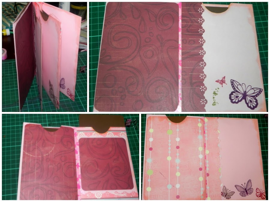 Las Paginas, como no cuento con mucho papel decorado, lo que hice fue a un lado ponerle el papel completo y al otro lado ponerle solo una tira perforada con un diseño de flores y un estampado sellos de mariposas en el final de la pagina.