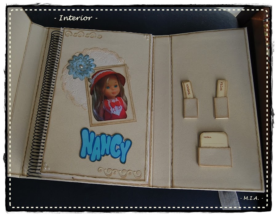 Cuando se abre nos encontramos con una libreta encuadernada y a la que he puesto, para darle color, la imagen de una Nancy, recortada y montada en doble cartulina simulando una foto, sobre otra mini-blonda, y el logotipo de esta muñeca. En los laterales unos troqueles que van haciendo juego con los esquineros utilizados en la portada. En una esquina de la imagen monté tres flores de tela de color de distintos tamaños y una perla nacarada en el centro. Tres perlitas en las esquinas termina la decoración. Esta libreta se puede sacar para trabajarla, ya que va insertada en un bolsillo. En un lateral puse unos cajoncitos contenedores de las etiquetas que adornan las hojas interiores por si quiere añadir más páginas.