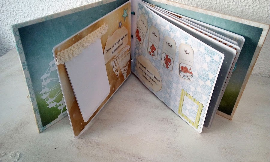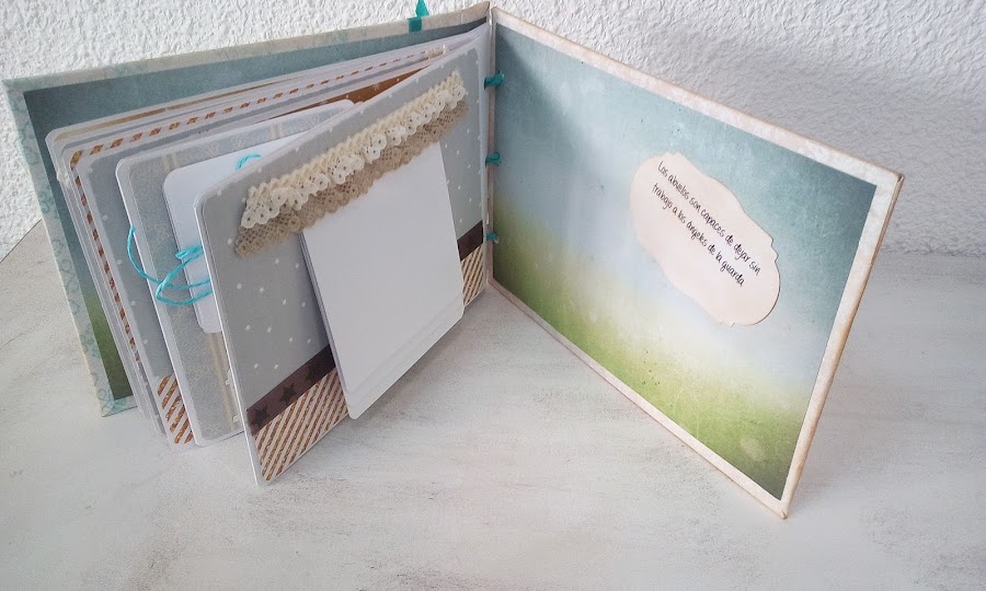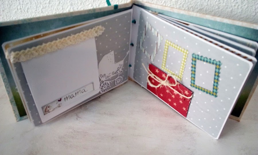 Nuevo álbum para un bebé, esta vez, huyendo de colores suaves, típicos. Los papás querían colores alegres. Así quedó, con encuadernación japonesa y 10 páginas tamaño folio.