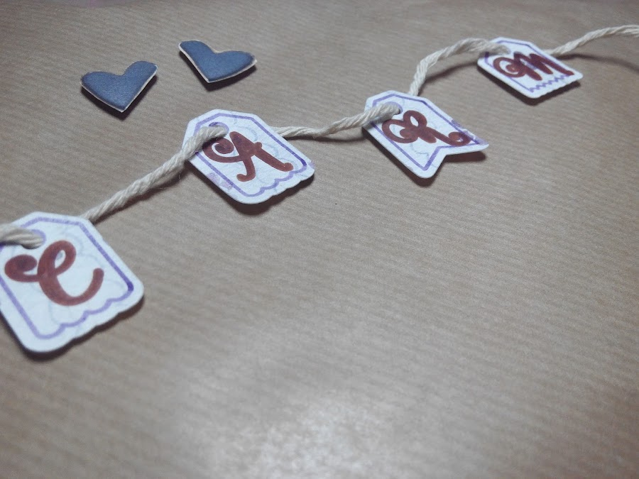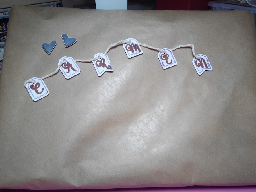La falta de tiempo no me dejó hacer un envoltorio más elaborado, como a mí me hubiera gustado. Aún así, dibujé las iniciales de su nombre para hacer una guirnalda que adornara un poquito el embalaje y le puse un par de corazones. No quedó mal del todo!!