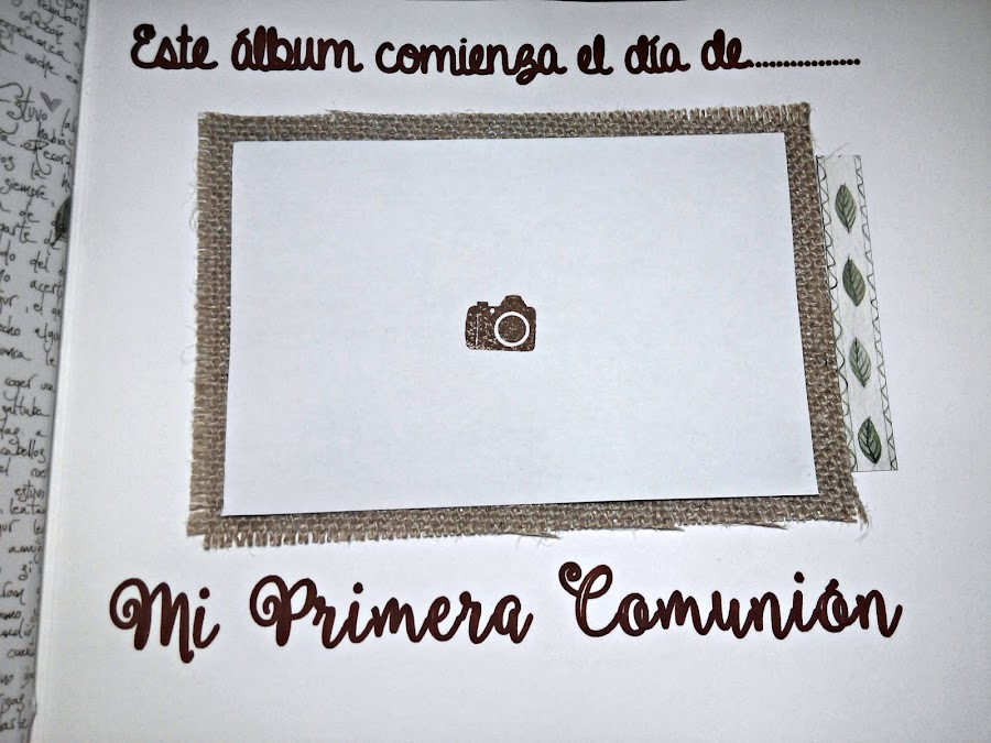 Por dentro, el álbum comienza con una foto central del dia de la comunión, colocada sobre un trozo de arpillera. Luego podrá poner fotos con los invitados, y una parte donde éstos podrán firmar.