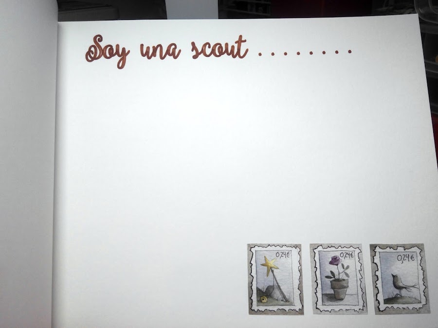 "Mi familia", "Mis cumpleaños", "Mis amigos y amigas", "Soy una scout..." y muchas hojas en blanco por si ella quiere poner otras secciones o para que pegue todas las fotos que quiera de sus mejores momentos