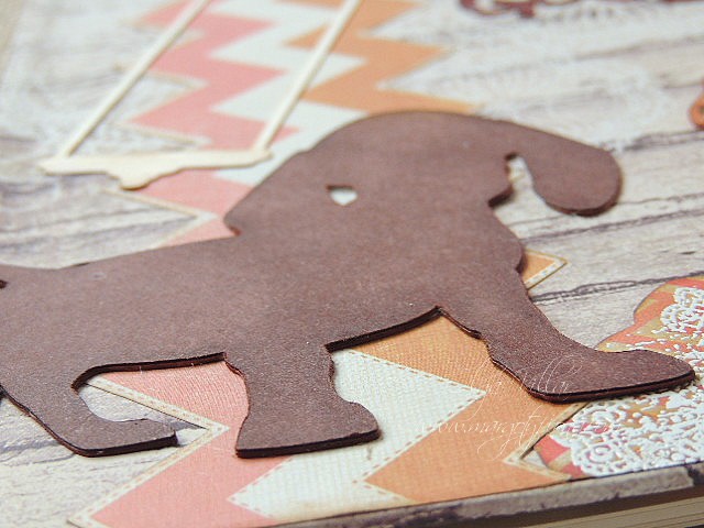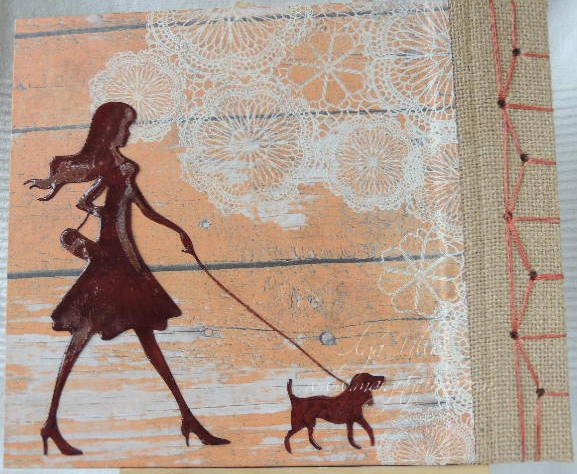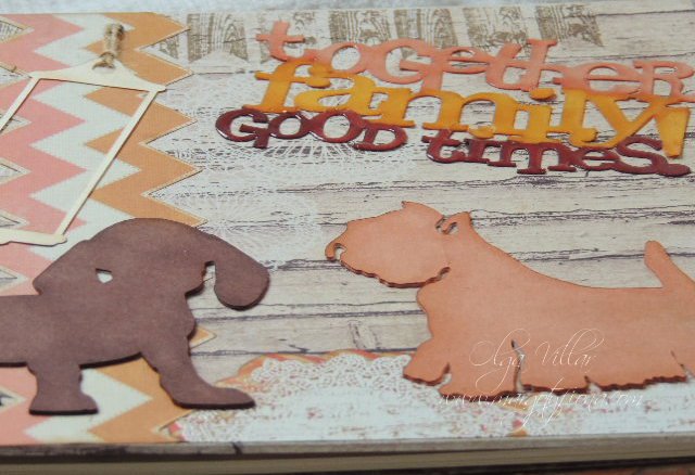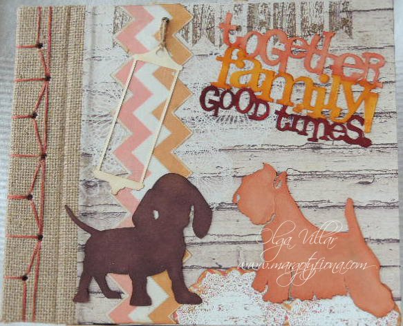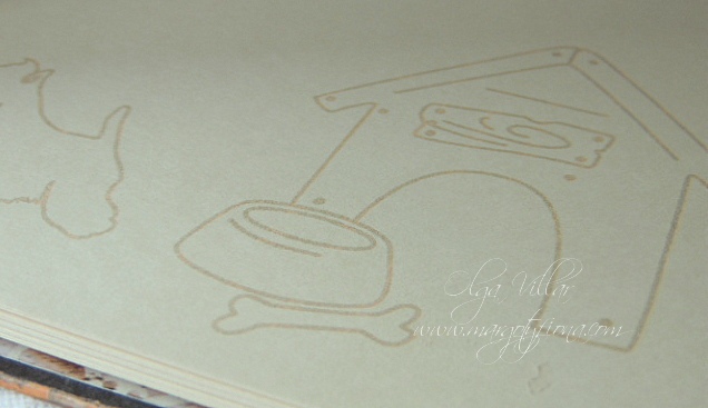 Y la parte delantera, las siluetas divertidas de unos perritos en falso chipboard, coloreados con colores al agua... ( si , desde luego me siento mucho mas cómoda coloreando con este tipo de pinturas), al igual que la leyenda de la portada, que en este caso está embosada con polvos clear de Artemio.