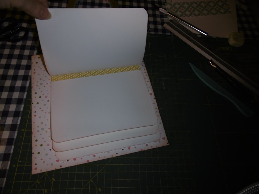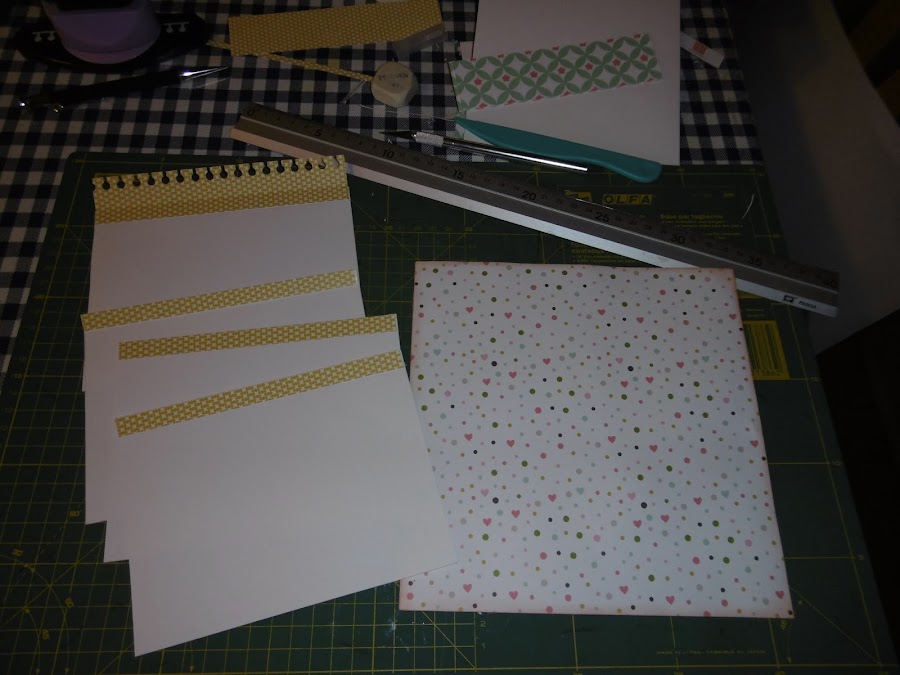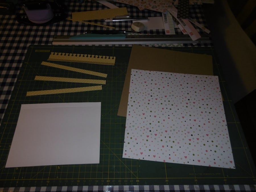 Tenemos la base de papel kraf de 20X20cm, hoja de papel decorado de 20X20cm, 4 cartulinas blancas de 16x12cm marcadas a un cm en la parte superior, tiras de papel decorado 3 de 16X1cm y una de 16x3cm con borde troquelado.