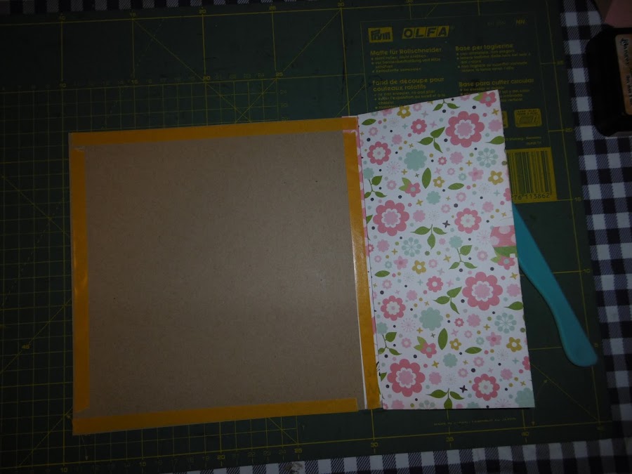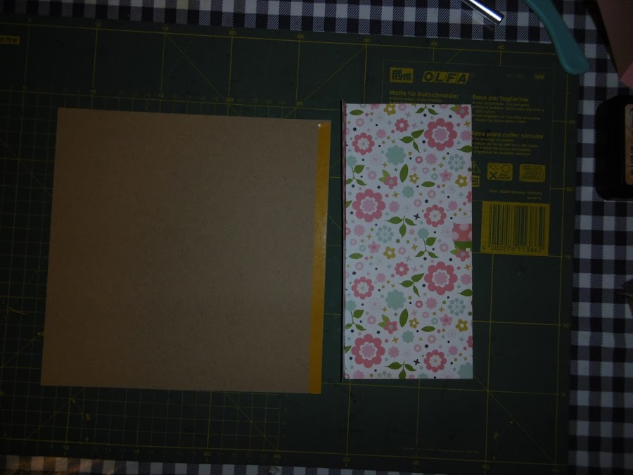 Sobre el doblez de la pestaña pegamos el papel decorado que cubre la base.