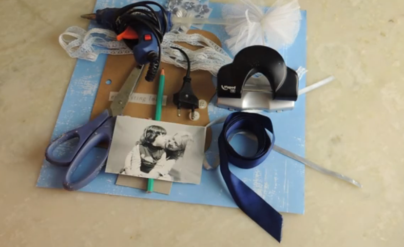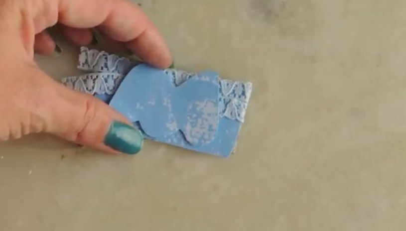 Pegamos cinta de encaje en el cartón, yo lo pegue y deje un sobrante, luego pegamos la letra por arriba.