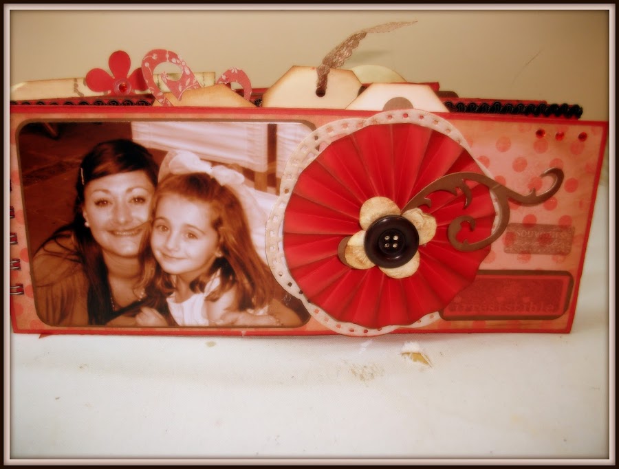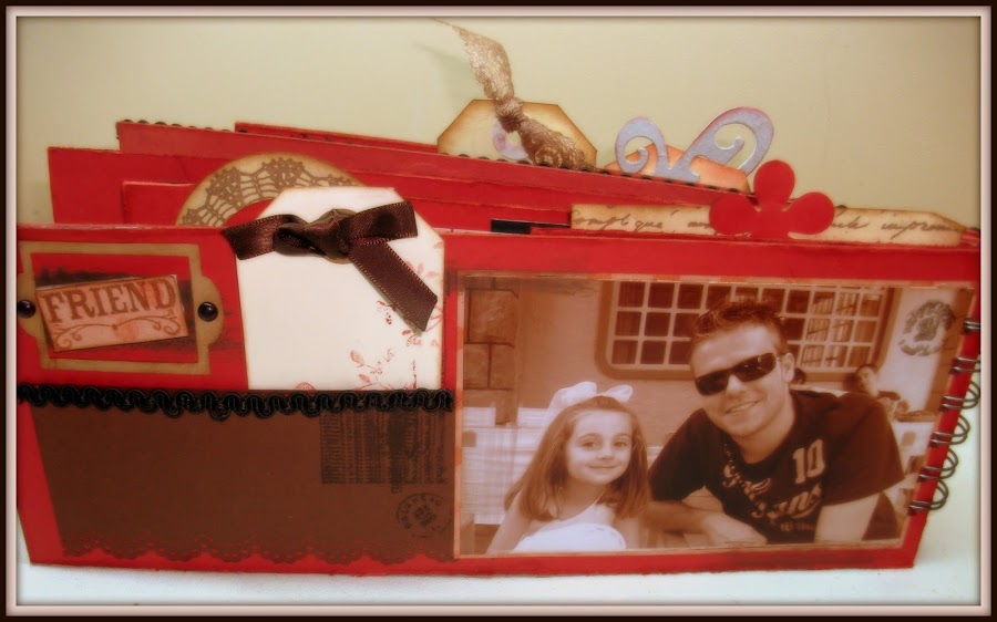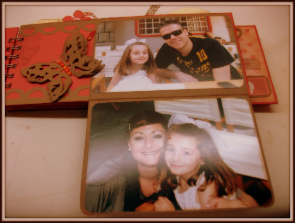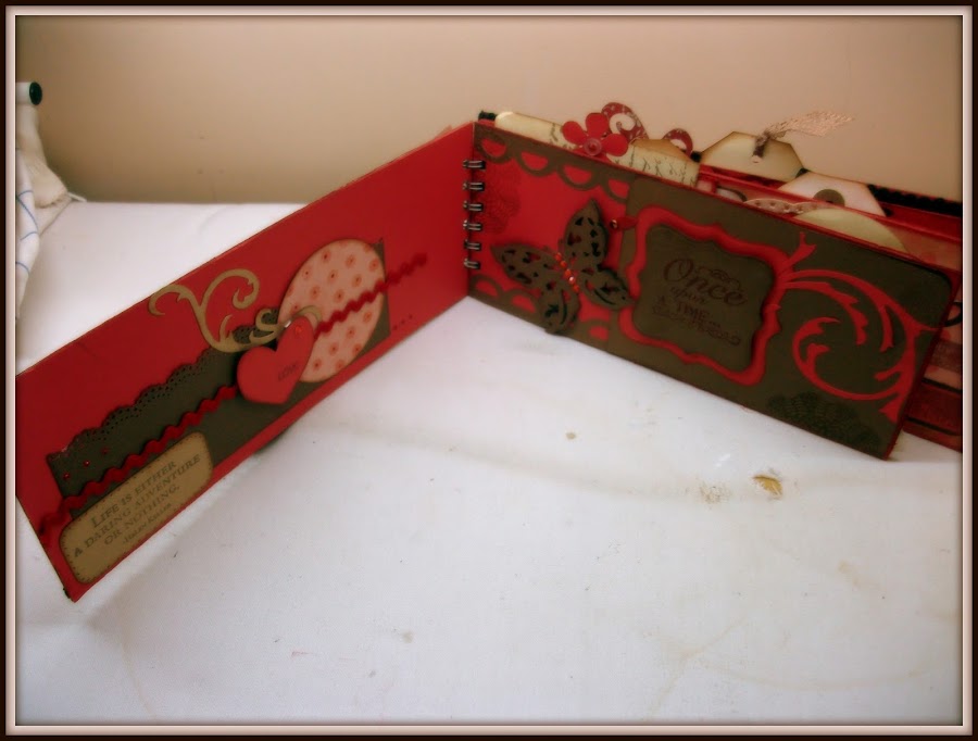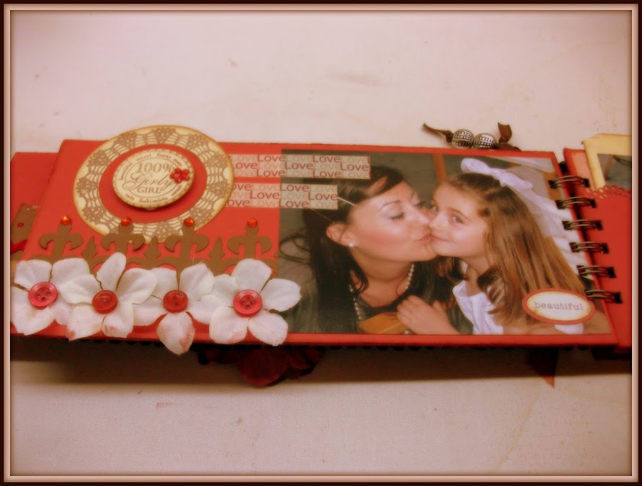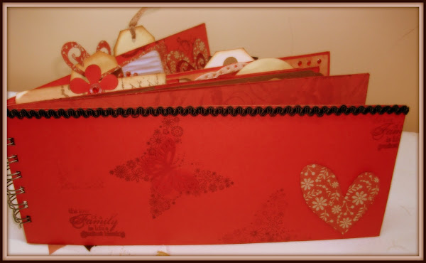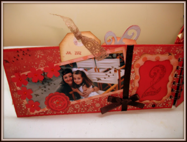 Es un álbum que hice con unos cartones duros que forre con cartulina en tono cereza, para decorar he usado papeles de My mind eyes de uno de los taco papeles que tanto me gustan, todos en los mismos tonos.