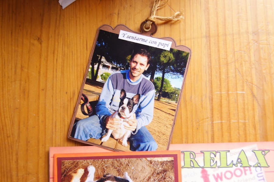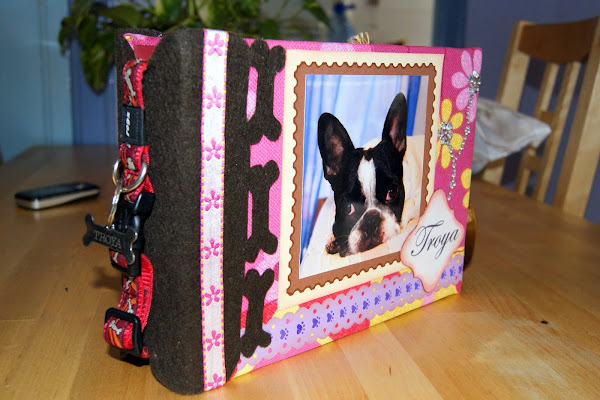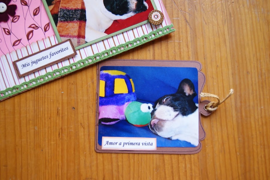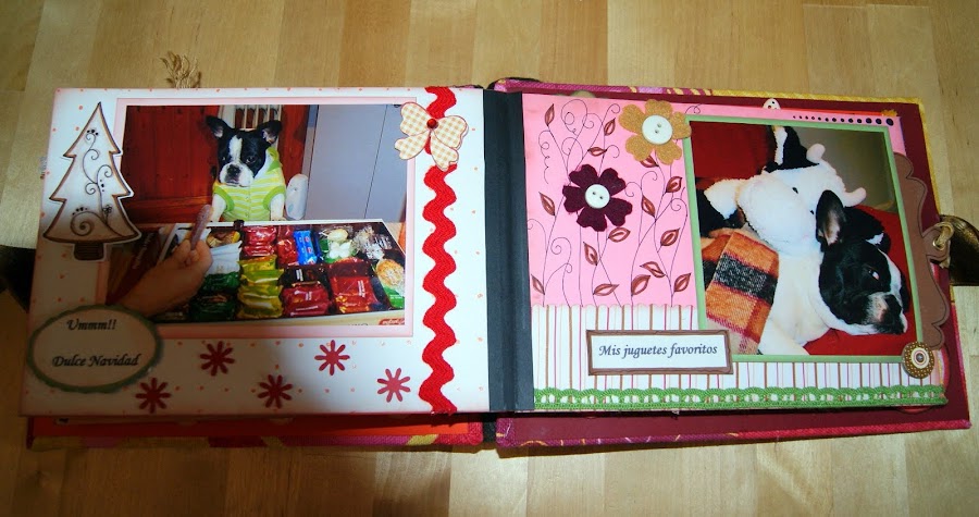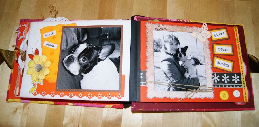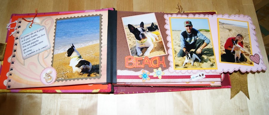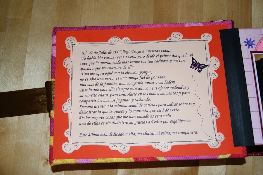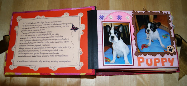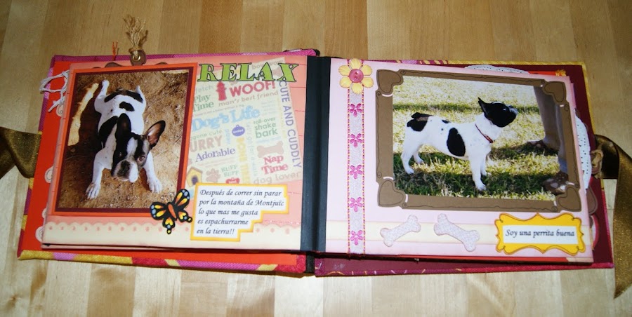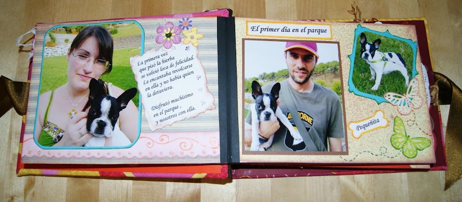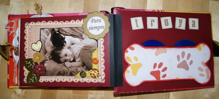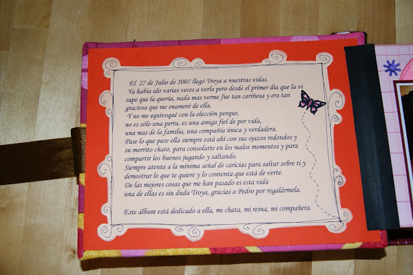 La portada lleva un collar suyo de cuando era pequeñita y al final lleva dos cd que grabamos con el primer día que llegó a casa,su primera vez que ladró,el primer día de playa ,lo que le gustaba chupetear los petit suisse..vamos un poquito de su vida que espero que dure mucho tiempo mas.