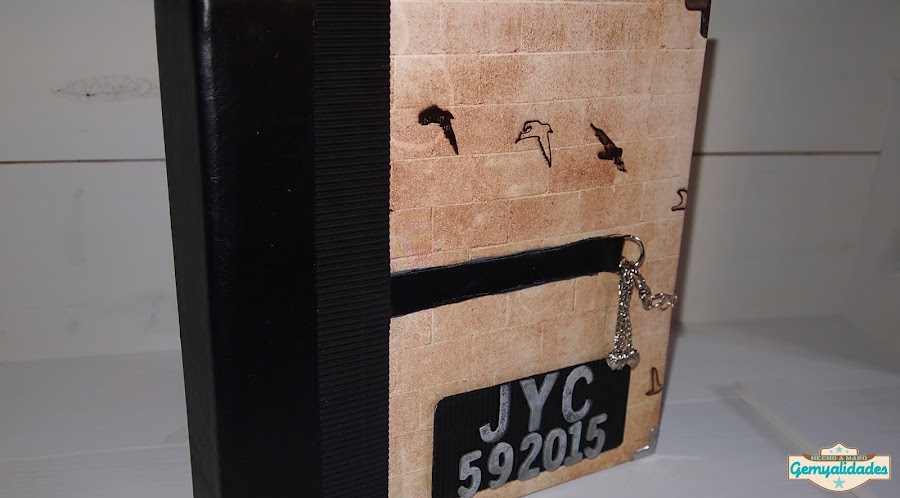 Para la portada y contraportada escogí este papel con unos ladrillos claritos y unos pájaros pintados, le hice el lomo con cartulina y luego, para reforzar y dar otro toque, le puse un cartón corrugado y polipiel negra. Lleva unas esquineras plateadas para proteger las esquinas y que no se dañen con el uso y el paso del tiempo.