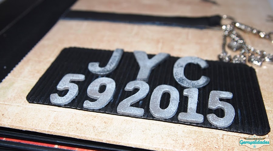 El rótulo de la portada está hecho con un trozo de cartón normal, debajo del cartón corrugado negro para darle más relieve y consistencia. Y las letras son de madera, pintadas con acrílico plateado y los bordes entintados.