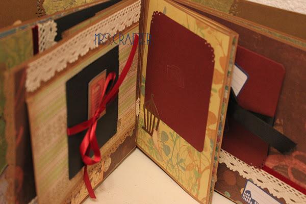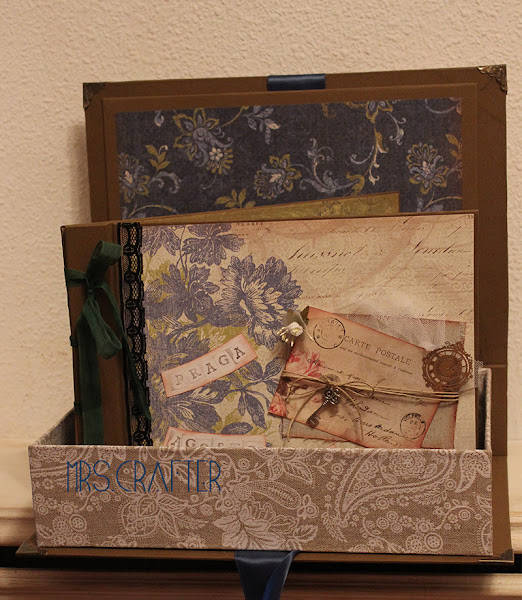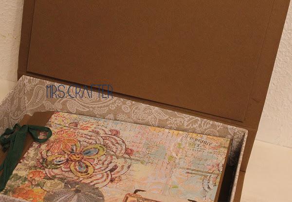 Coordinada con el álbum, la caja formato libro donde guardarlo, en los mismps pañles, aunque con unas telas preciosas en el contorno de la caja, y unas cantoneras preciosas de las que usamos en los talleres.