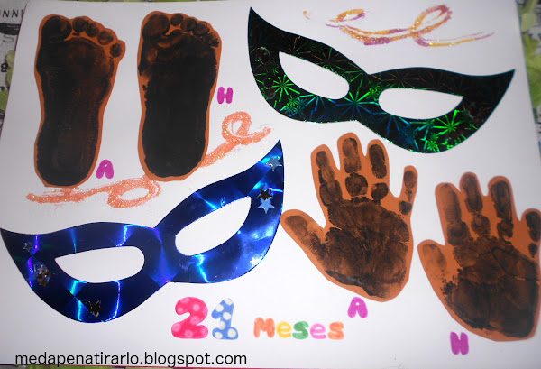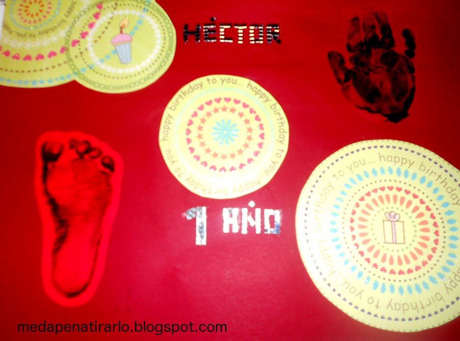 Al hermano le puse unos restos de cotillón de nochevieja y unas letras hechas con laca de uñas metalizada, regalada, para más inri. Que las lacas de uñas vienen fenomenal para pintar. Unas cartulinas lucen más que otras, pero qué narices, lo que importa son las huellas.