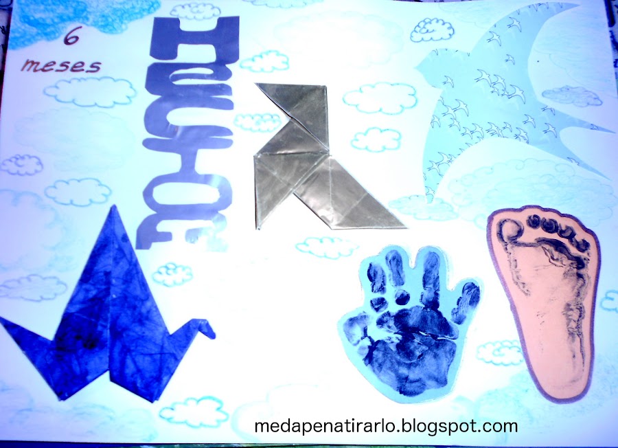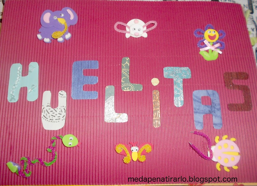 Atención al estirón de los 5 meses. Las letras están hechas con papel decorativo de unos blocs de papeles del mundo que venden en el Bricor. La mariposa está hecha en papel amarillo, marcada con rotulador y decorada con brillantina roja y azul, aunque no se aprecia en la foto. Muy resultona para repetir y decorar cualquier otra cosa.