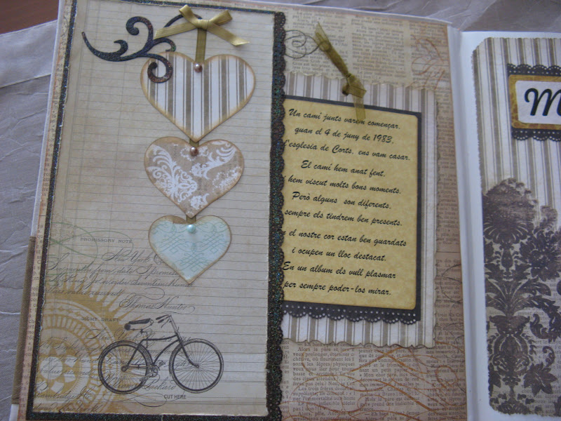 Evidentemente el primer acontecimiento inolbidable fué la boda, asi que el album lo empezaremos con esta fecha. En una de las paginas la invitación i en el otro una fotografi del dia. Estas pagina si que las he decorado con papel, pero las demas no lo haré ya que me quedaria un album demasido grues, ja que tiene bastantes paginas