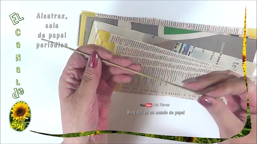 Cortamos las hojas de directorio telefónico en cuatro partes, y enrollamos con una brocheta de madera muy delgada, necesitamos diez varillas de papel, pegamos de dos en dos para obtener cinco varillas largas,