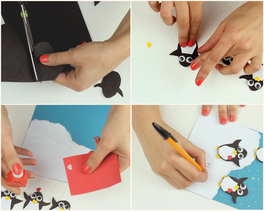 4. Luego con la troqueladora vuelve a crear corazoncitos que puedes pegar a los pingüinos para darles un toque más dulce. Con la silicona pega todos los elementos sobre la postal.