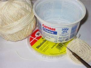 Reciclamos un tarro de mantequilla y empezamos por la base, trabajando en redondo, con punto altos, con hilo delgado. No hay nstrucciones precisas, pero pueden ir midiendo y pues yo creo que seran unos 10 puntos altos en el anillo magico y van aumentando.