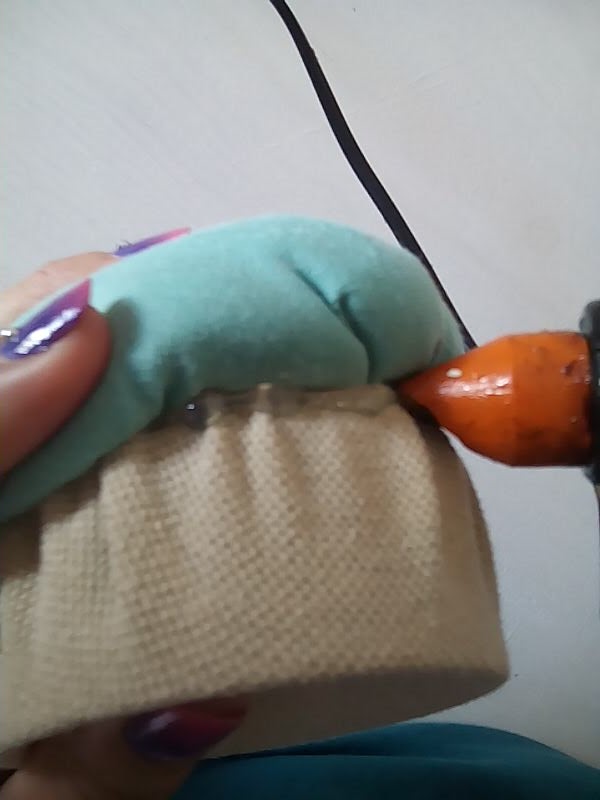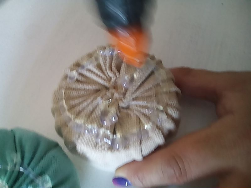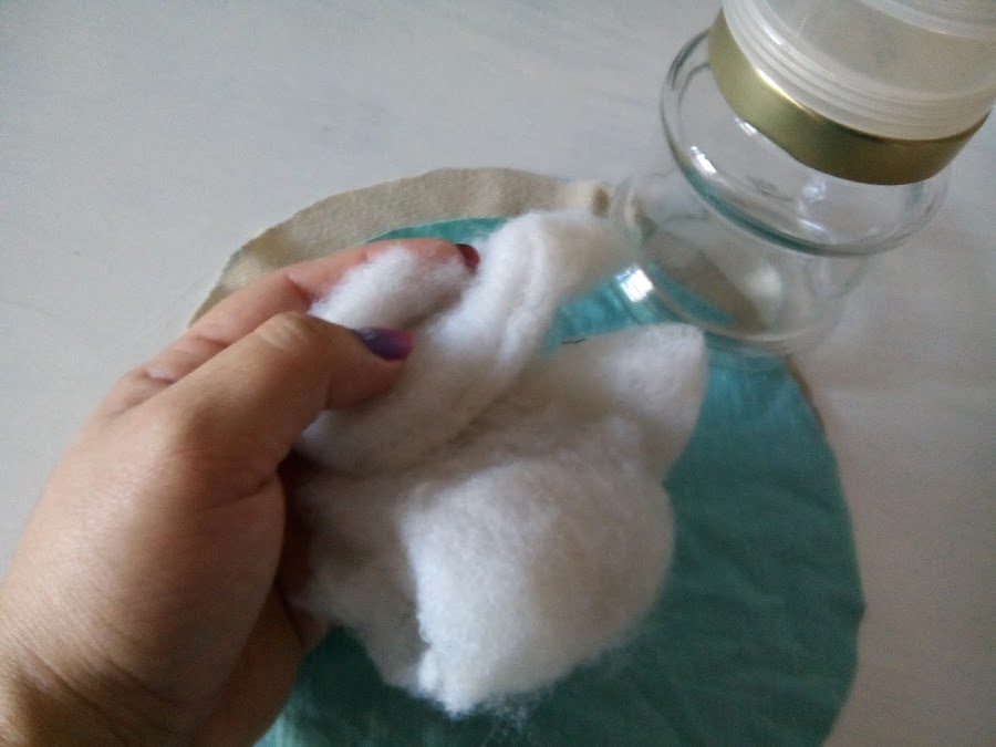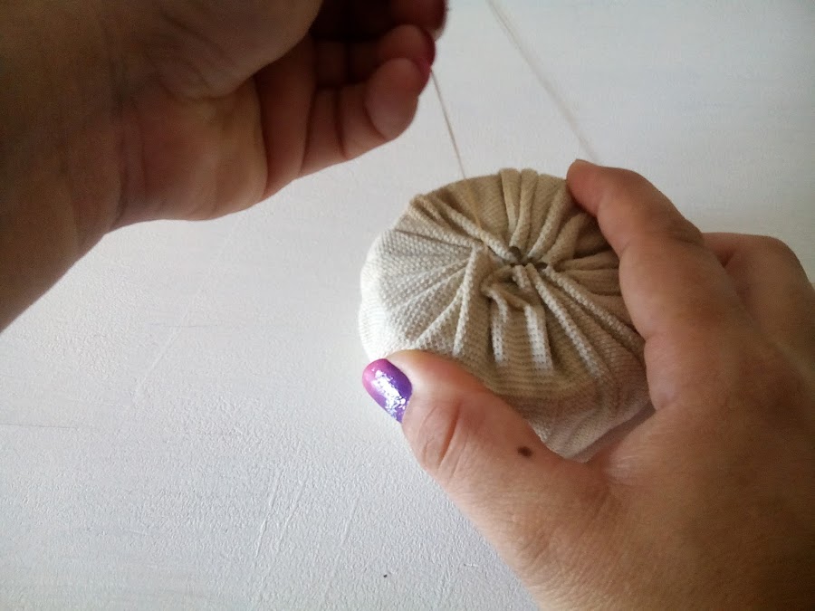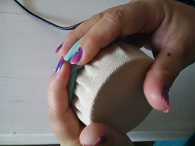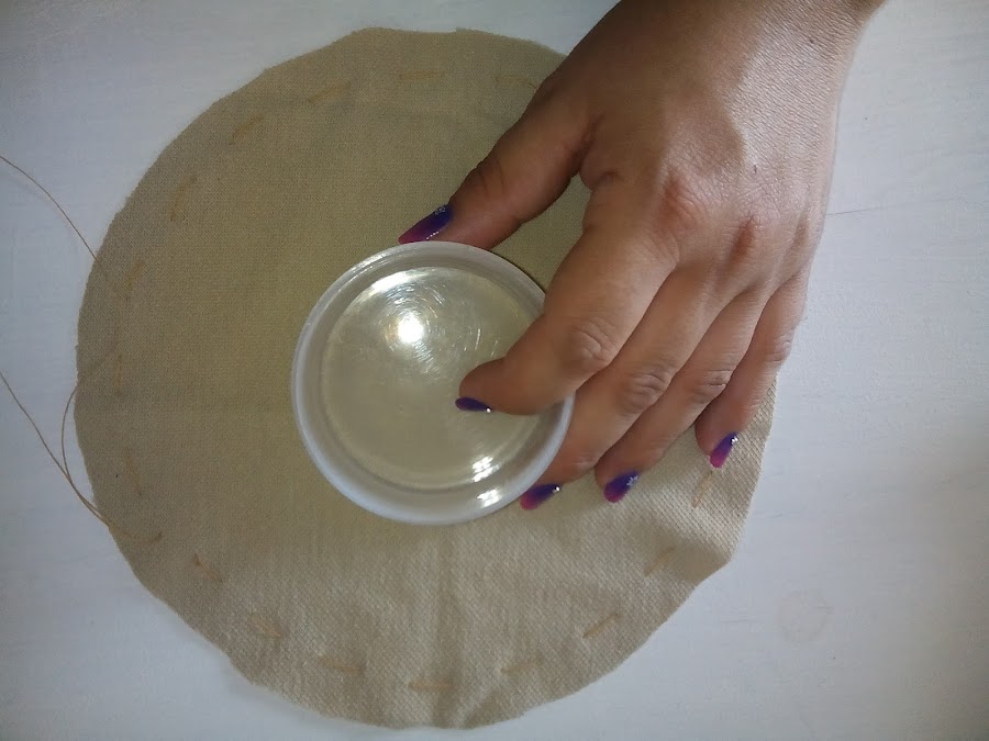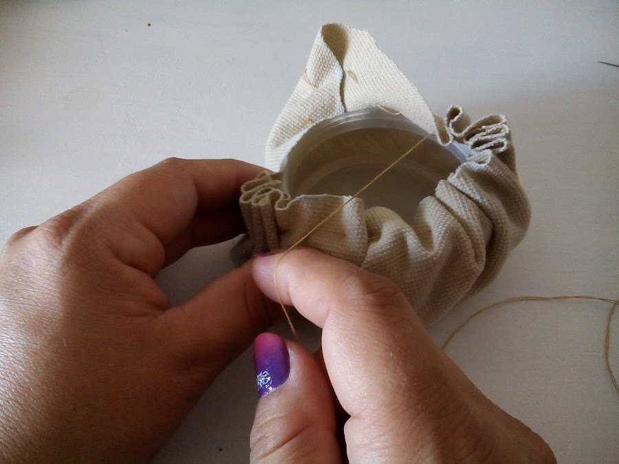 Y con cuidado y poco a poco vamos a tirar del hilo del hilván para que la tela se encoja y cubra toda la tarrina, de ésta forma:
