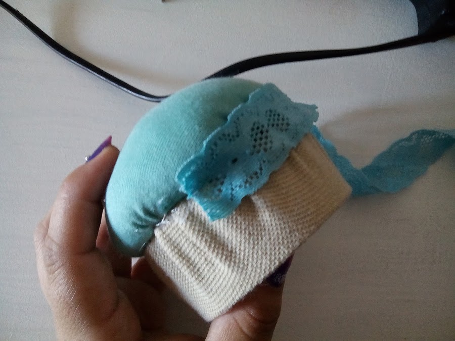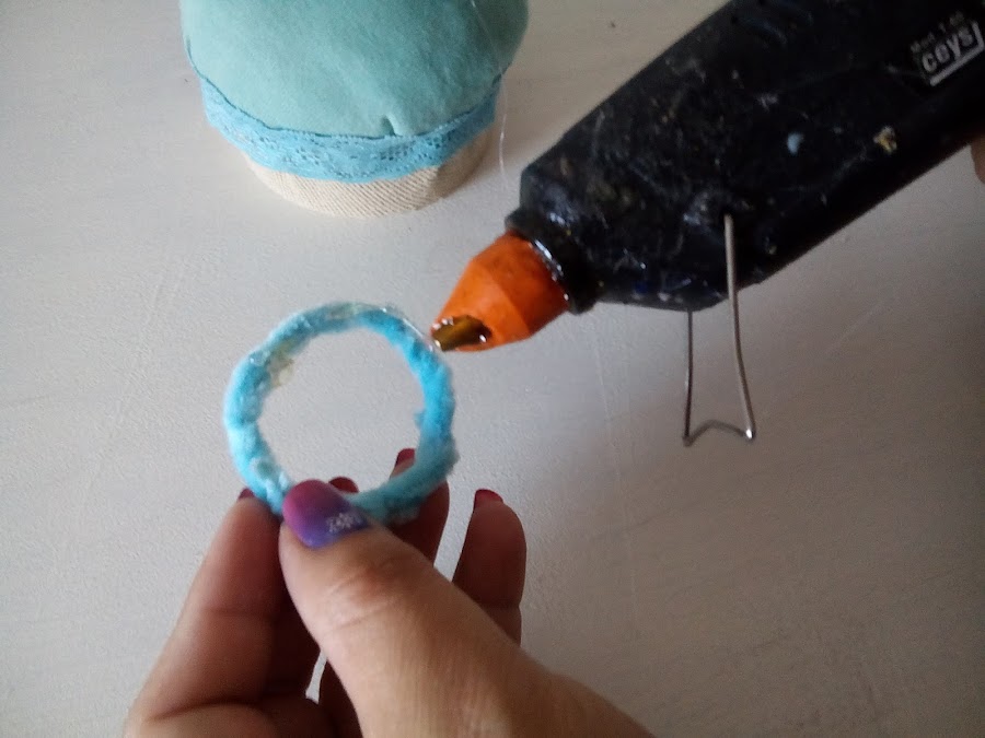 Primero le puse una cinta de encaje alrededor, justo en la unión de la base y la parte de arriba