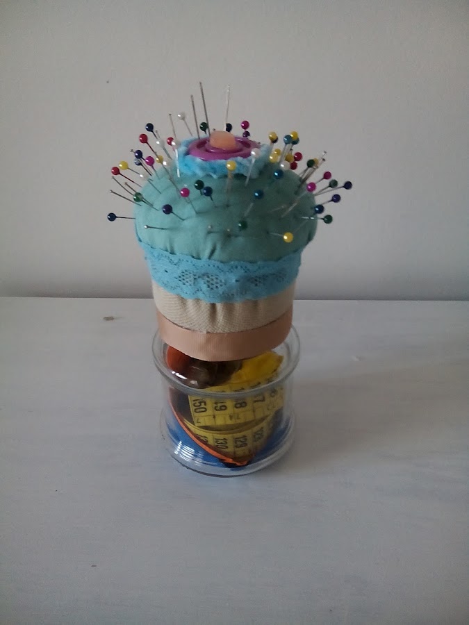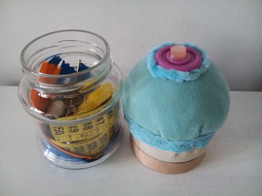 El frasco como ya os dije antes es opcional, pero a mi me gustó y certifico que me facilita las cosas porque tengo en un mismo sitio lo indispensable a la hora de hacer cualquier manualidad o labor de costura (cinta métrica, tiza de sastre, imperdibles, descosedor etc.) así que cuando estoy con mis labores ya no tengo que levantarme a cada rato a buscar las cosas que ahora sí tengo a la mano y en un solo sitio y además puedo llevarlo cómodamente de un lado a otro.
