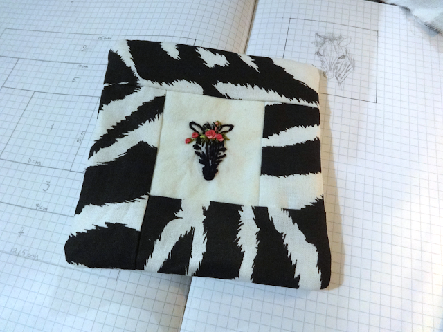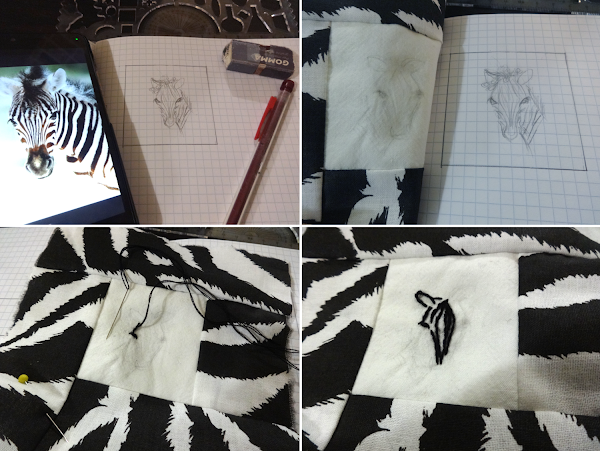 El diseño de la cebra es hecho a mano alzada usando como modelo la cebra de la fotografía, para facilitar las cosas he hecho un transfer colocando la tela sobre la cebra dibujada y haciendo presión , ven que fácil hago la cosas , con este diseño me he guiado para bordar la cebra con hilazas a dos hilos