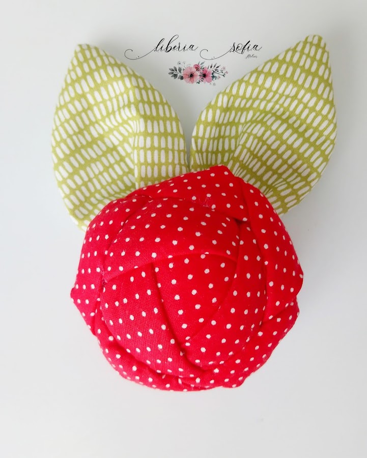Una vez tengas todos los pétalos cosidos a la bola base, coloca las hojas donde más te gusten sujetándolas con unas puntadas, tapa con el circulo base todas las puntadas y los lados menos bonitos de los pétalos, este circulo debes coserlo con puntada escondida por todo su contorno.
