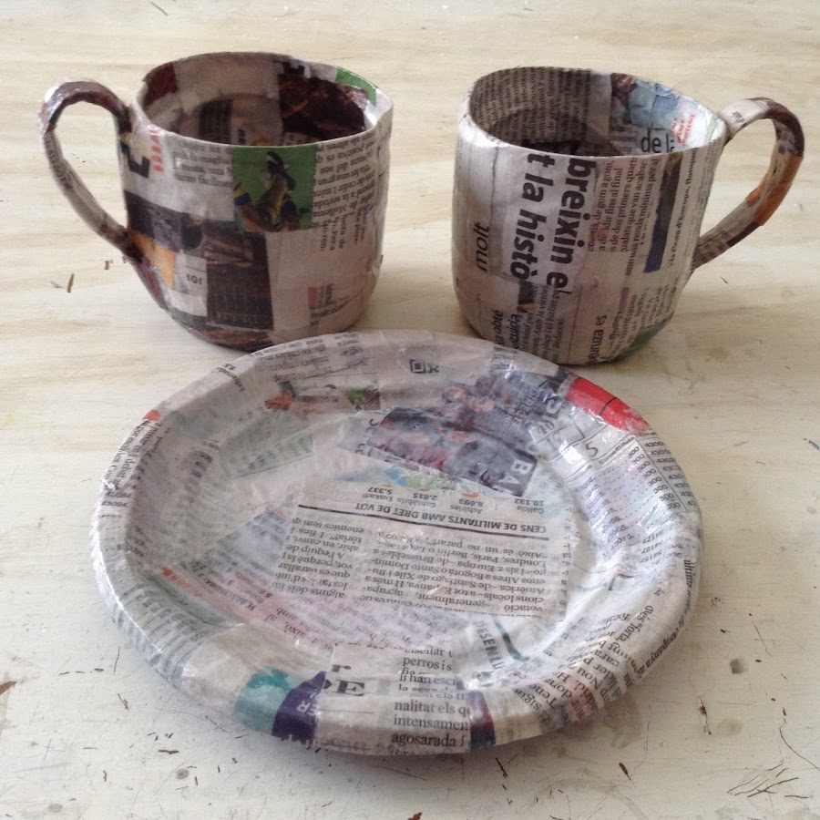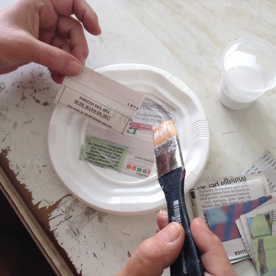 Bien, vamos a continuar. Ahora coge 3 platos de plástico desechables,colócalos uno encima de otro y forra el plato de la misma forma que has hecho con las tazas, con cuadritos de papel de periódico,cola universal blanca mezclada con unas gotas de agua, ayudándote con una brocha o pincel de esta forma,