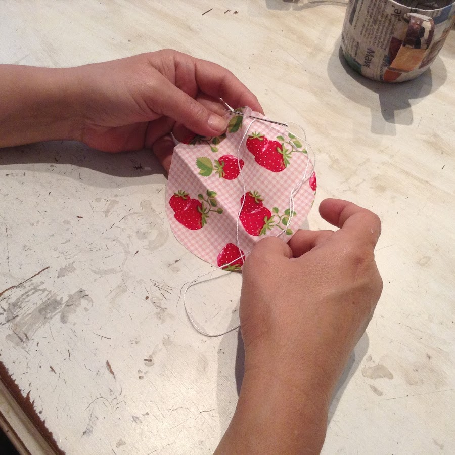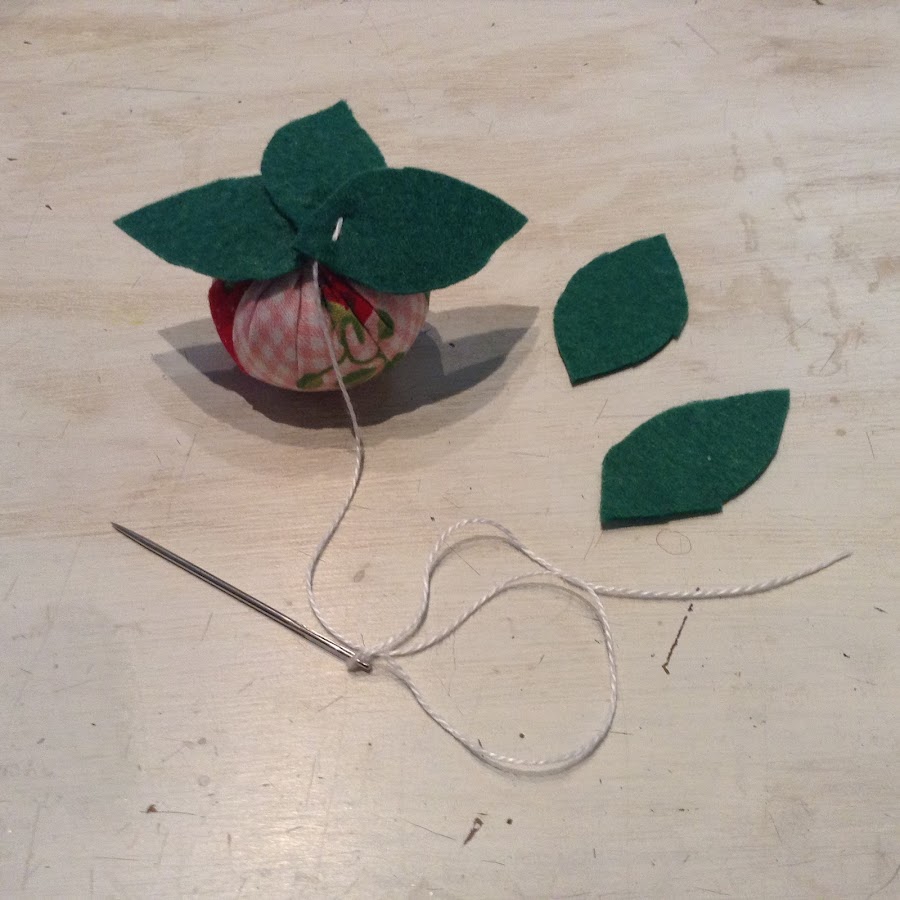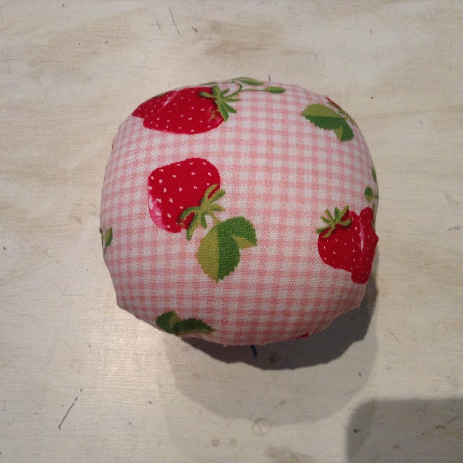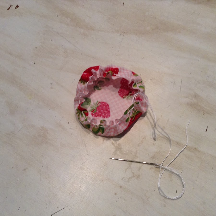 Este se hace cortando un circulo de tela de unos 9 cms. de diámetro. Pasas un hilván alrededor, tiras de los hilos y lo rellenas (como has hecho con el alfileterogrande)