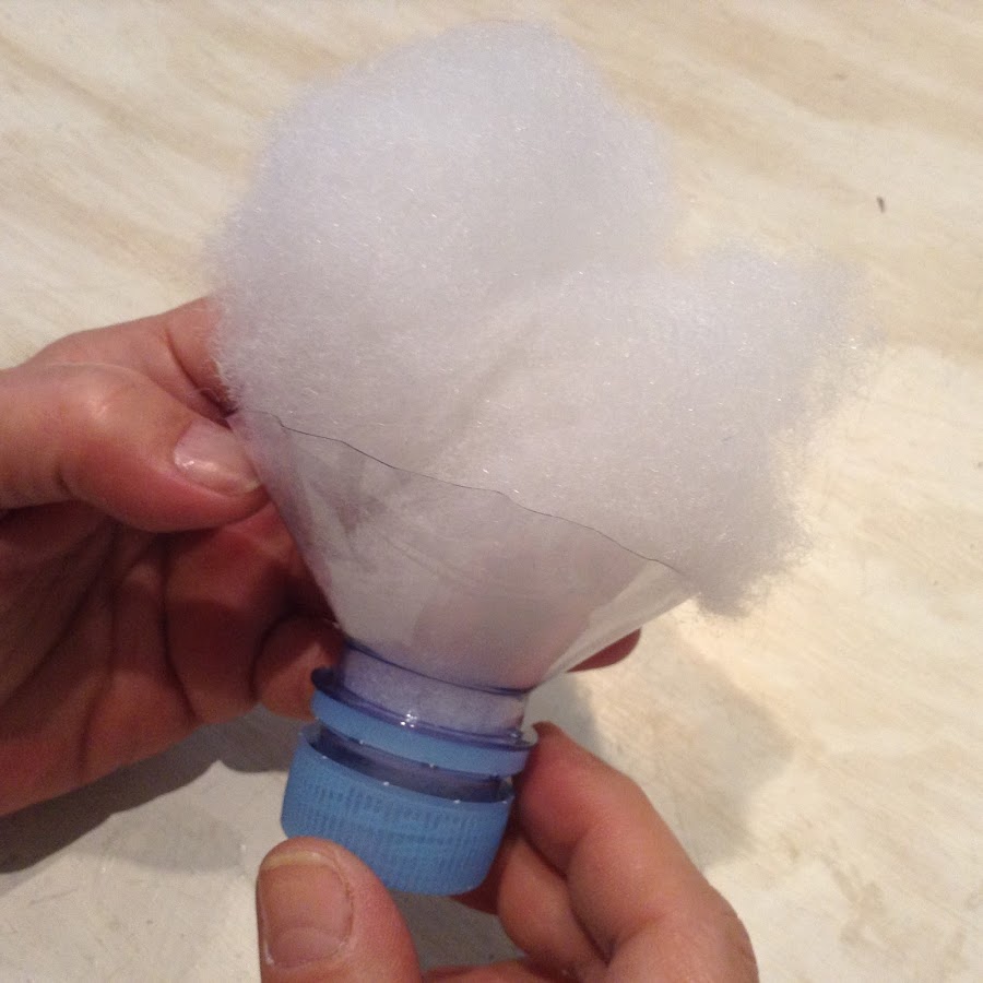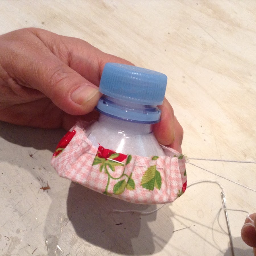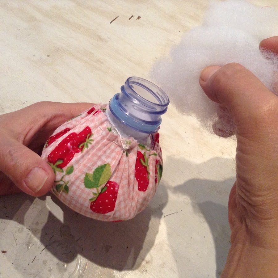 Ahora, abre el tapón y continúa rellenando a tope por la boca de la botella. Piensa que debe quedar la tela completamente lisa y apretada por el relleno. Si hace falta ayúdate con un bolígrafo o palo para que el relleno te llegue bien a los cantos de dentro.
