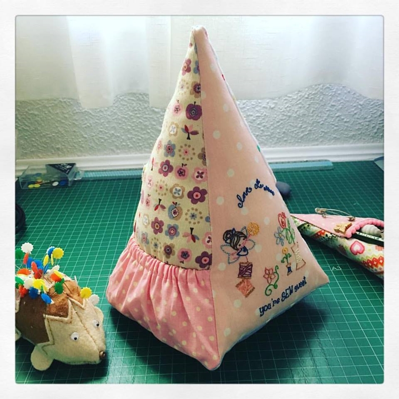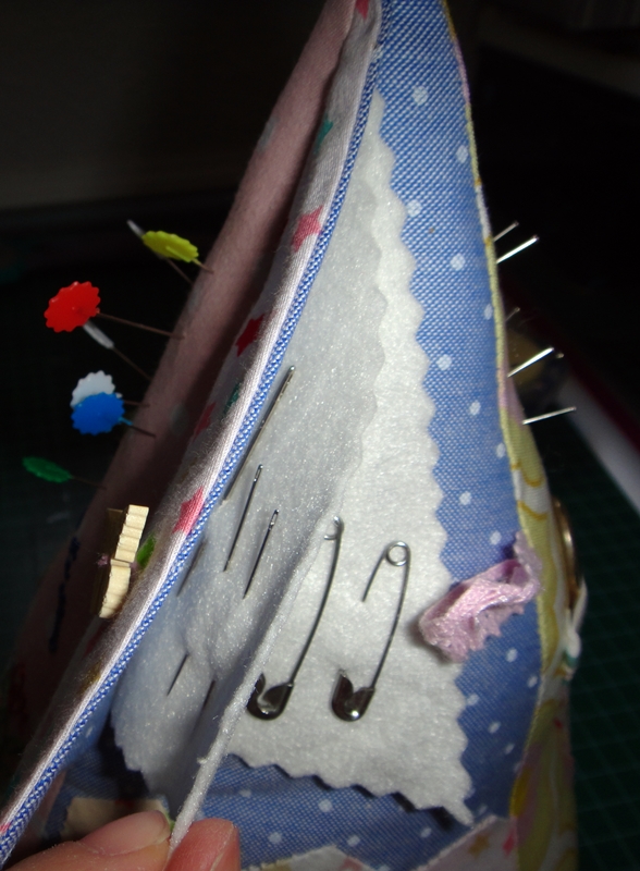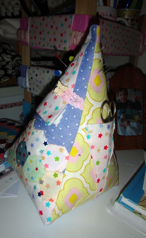 En esta cara he utilizado telas de otros elementos que tengo en la mesa de costura, como el erizo o la funda para las tijeras, para que quede todo conjuntado con una continuidad.