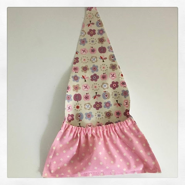 El bolsillo lo haremos con un rectángulo de tela de 18x12 cm y una goma elástica de 10 cm. Cosemos en el bolsillo un dobladillo de 1 cm (doblando la tela dos veces hacia adentro, es decir doblamos 1 cm y luego otro cm). Cosemos la parte inferior del bolsillo a la base del triángulo. Pasamos la goma elástica por el dobladillo, ayudándonos con un imperdible y sujetando bien los extremos.