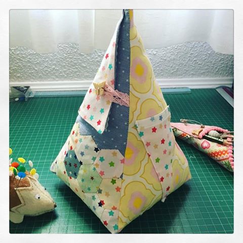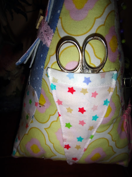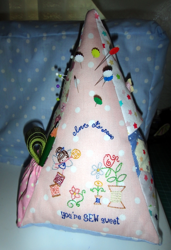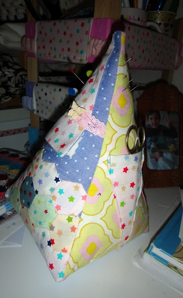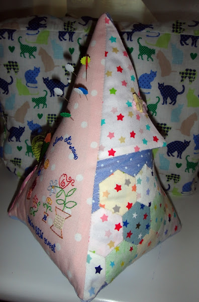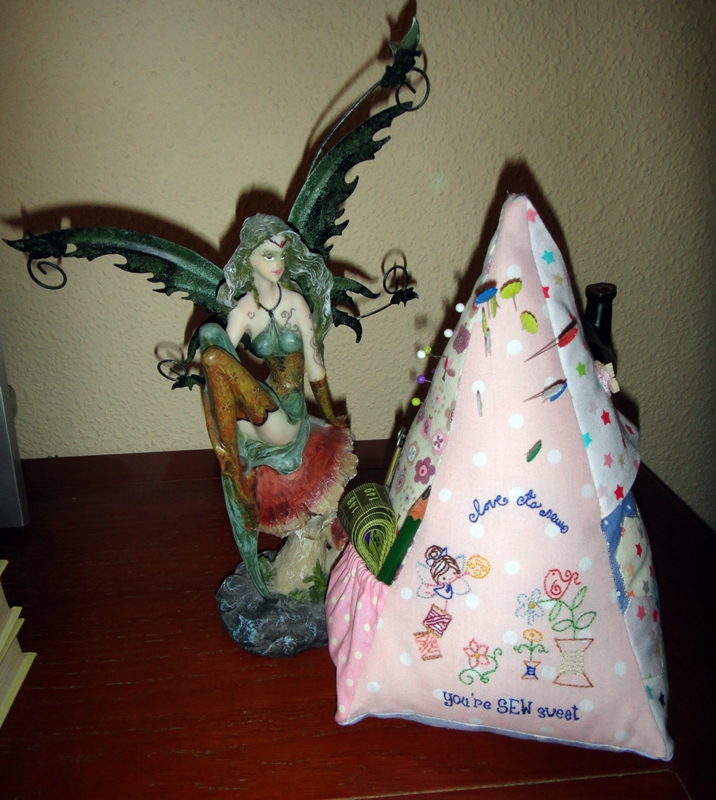 Coséis las tres piezas al borde del triángulo de debajo, y una cinta para cerrar al otro lado. El botón no lo pongáis hasta que no esté todo el alfiletero montado (yo lo puse en la foto para ver el efecto, pero está sin coser).