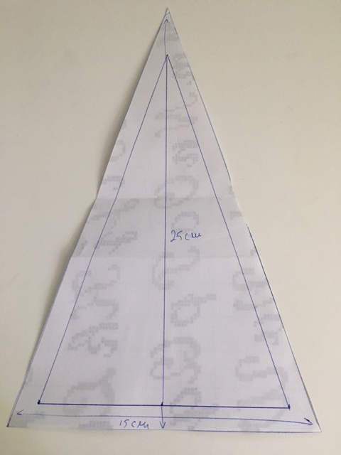 Tenéis que dibujar un triángulo isósceles de 15 cm de base y 25 cm de altura. A esto le añadís 1 cm de margen de costura a cada lado, y formará cada una de las caras de vuestra pirámide.
