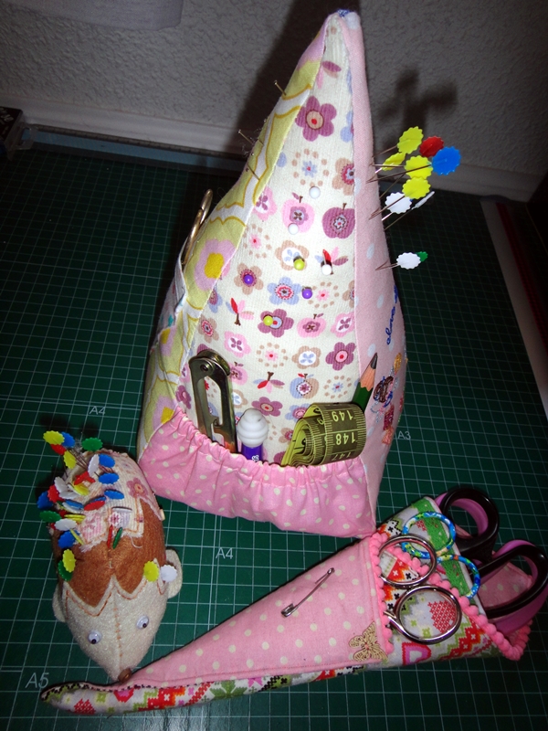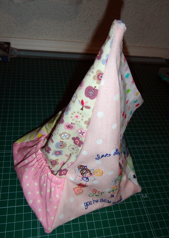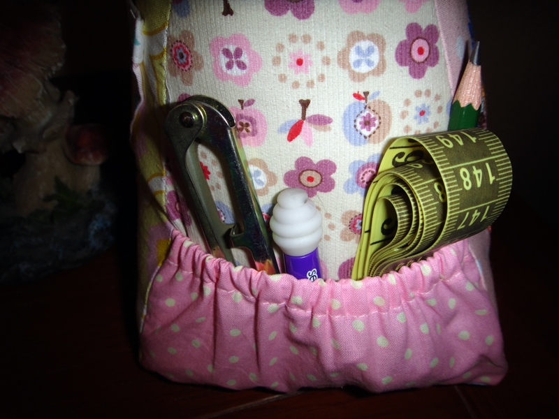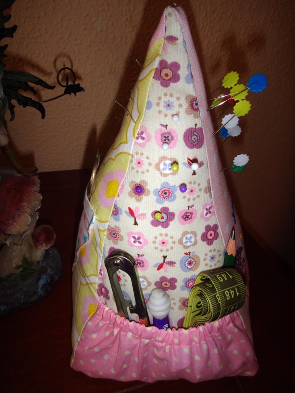 Finalmente, cosemos los lados del bolsillo a los lados del triángulo. Nos quedará una forma un poco rara por efecto de la goma, pero no os preocupéis porque se arregla cuando el alfiletero esté montado. Queda un bolsillo de bastante capacidad para utensilios pequeños que conviene tener a mano.