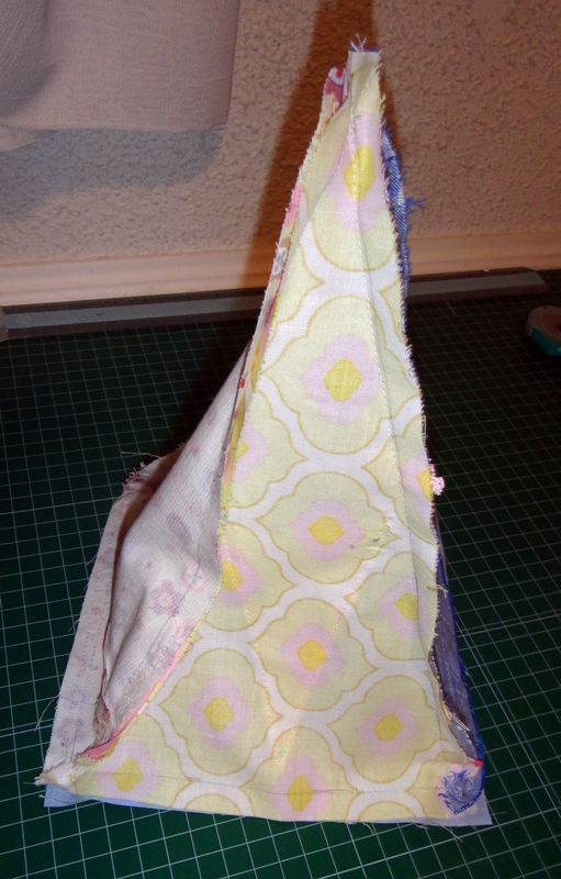 Para unir todas las caras, coséis desde la base hasta el vértice cada cara a la de al lado, enfrentando derecho con derecho. Finalmente, ponéis el cuadrado de la base, y dejáis una abertura en uno de los lados para dar la vuelta (os recomiendo que la abertura la dejéis en la cara D, es la que menos problemas os dará para cerrar con puntada escondida). Por el revés os quedará así.