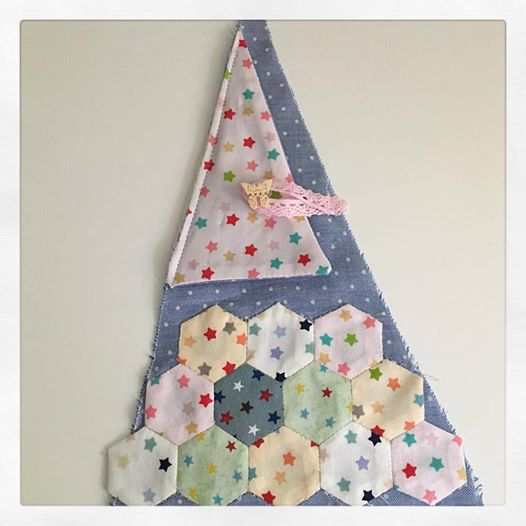 Esta cara lleva hexágonos de 2 cm realizados con la técnica del paper piecing. Van unidos entre sí con un repulgo, y cosidos a la tela de debajo con puntada escondida (quitad los papeles antes de coser a la tela de debajo).
