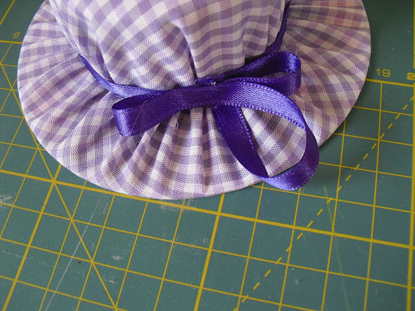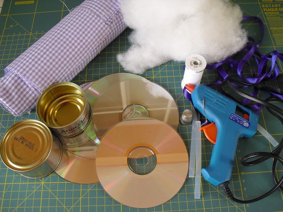 Hacemos lo mismo que con el CD, pero con la lata, la ponemos bocabajo en medio del circulo pequeño, titamos de los hilos, repartimos un poco el frunce, fijamos con unos nudos y con puntadas atravesando el medio.