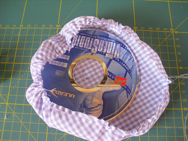Cogemos el circulo grande y ponemos el CD en medio y tiramos del hilo para fruncir.