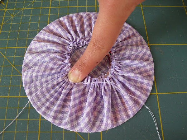 Cogemos el circulo grande y ponemos el CD en medio y tiramos del hilo para fruncir.