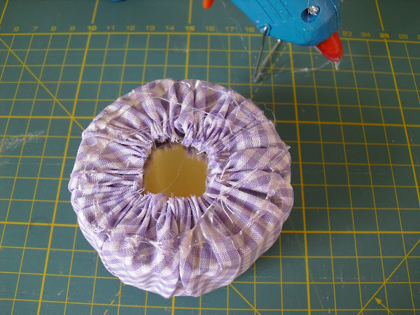 Hacemos lo mismo que con el CD, pero con la lata, la ponemos bocabajo en medio del circulo pequeño, titamos de los hilos, repartimos un poco el frunce, fijamos con unos nudos y con puntadas atravesando el medio.