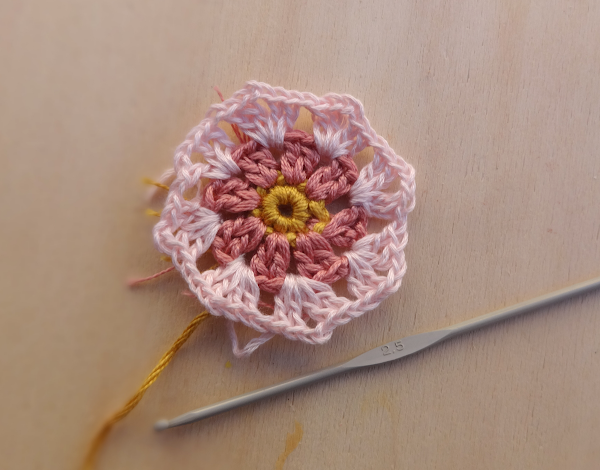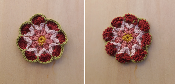 En cada vuelta se cambia el color del hilo, en la primera imagen está el frente de la flor y en la segunda el posterior, casi nunca enseño esta parte pero es importante tener en cuenta que los acabados deben tener una buena terminación ya que la flor es calada