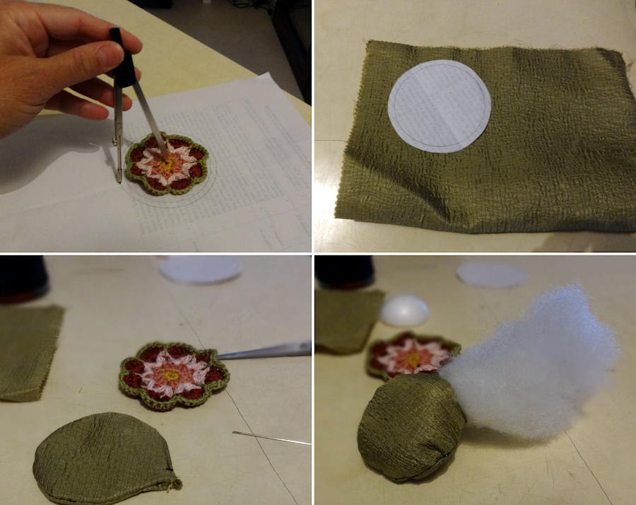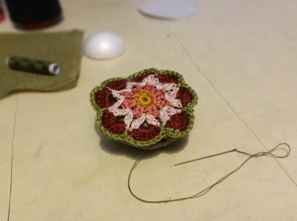 Por ultimo, con hilo similar a la tela, he cosido con puntadas invisibles para pegar la flor de crochet al pequeño cojín, quiero que sepan que olvidé por completo introducir el trozo de poliestireno al interior del cojín y solo me di cuenta en esta fotografía...