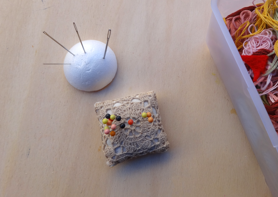 Aunque últimamente he estado usando este trozo de poliestireno... aun lado de él he colocado el primer alfiletero en crochet que tejí, de esto hace más de 25 años... así que para elaborar este nuevo alfiletero decidí utilizar el trozo de poliestireno como relleno ya que este material soporta las agujas muy bien