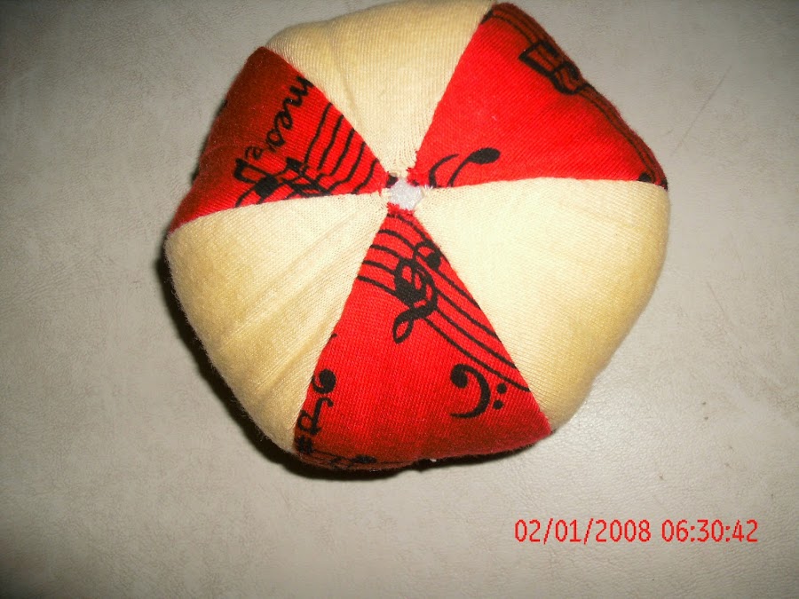 TIENE 6 GAJOS IGUAL QUE LA PELOTA, Y EN DOS COLORES CONTRASTANTES, ESTA RELLENO CON VELLÓN Y ARMADO CON EL MISMO MÉTODO QUE LA PELOTA