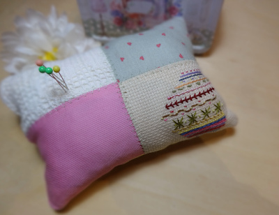 Este alfiletero es la unión de varios proyectos que se habían quedado en el camino, la tira bordada la hizo una vecina y me la regalaron con varios hilos e hilazas, era muy antigua y noté que no estaba terminada, quizás por falta de hilo... la he lavado muy bien para remover la tonalidad amarillenta del paso del tiempo y corte un cuadro (y la he estado usando en otros proyectos)