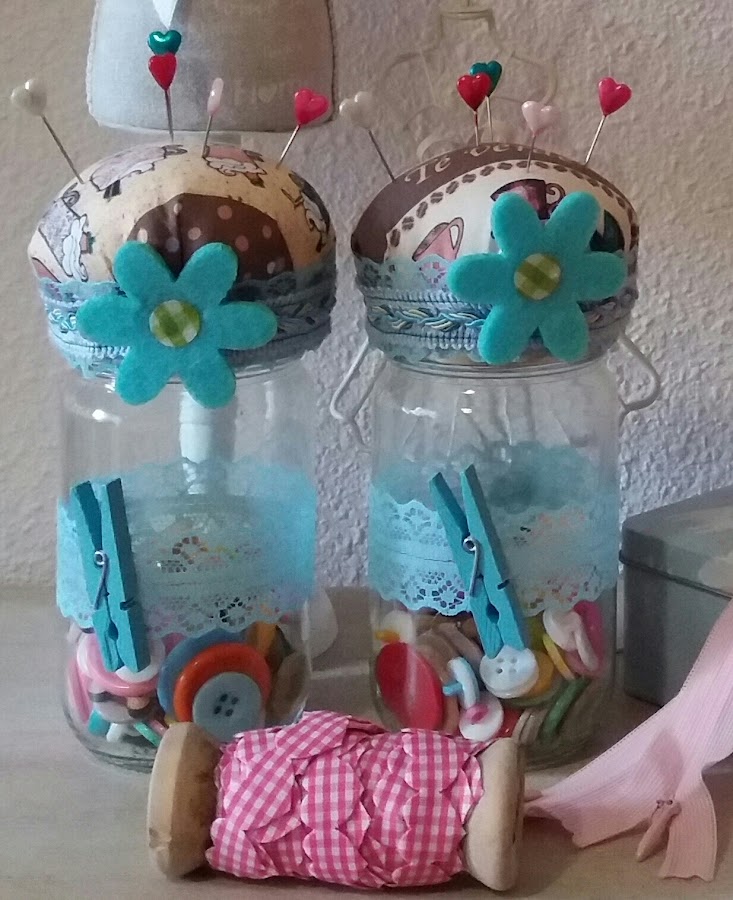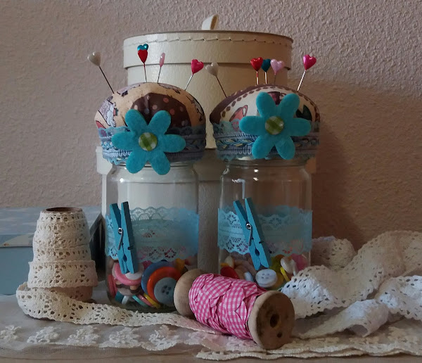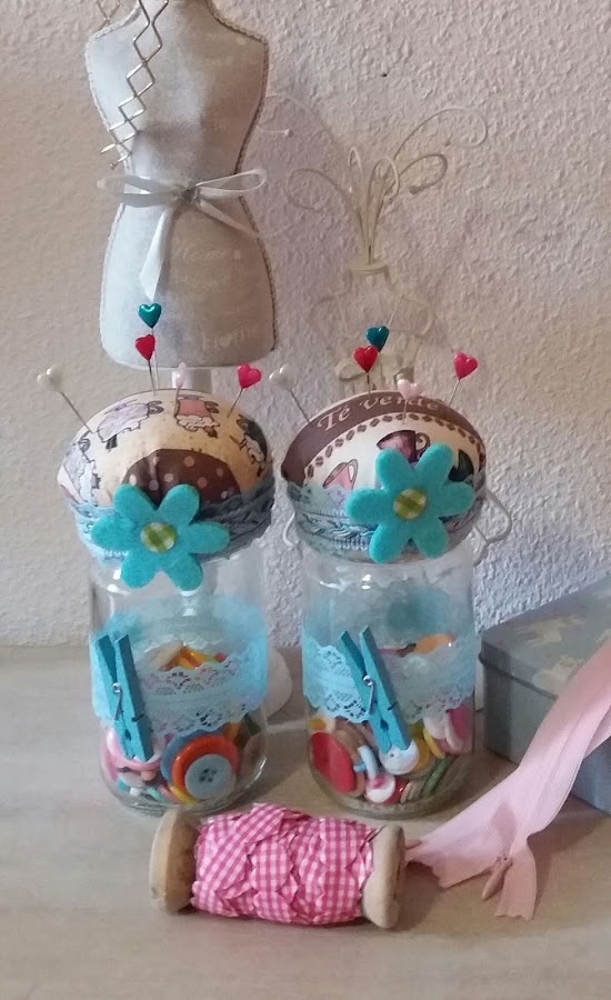 En otras entradas , os he mostrado varios tarros reciclados y convertidos en bonitos jarrones. Como cada día van saliendo nuevos tarritos de cristal y la verdad , me da pena tirarlos a la basura, sigo reciclándolos, esta vez he hecho dos alfileteros gemelos para dos amigas.