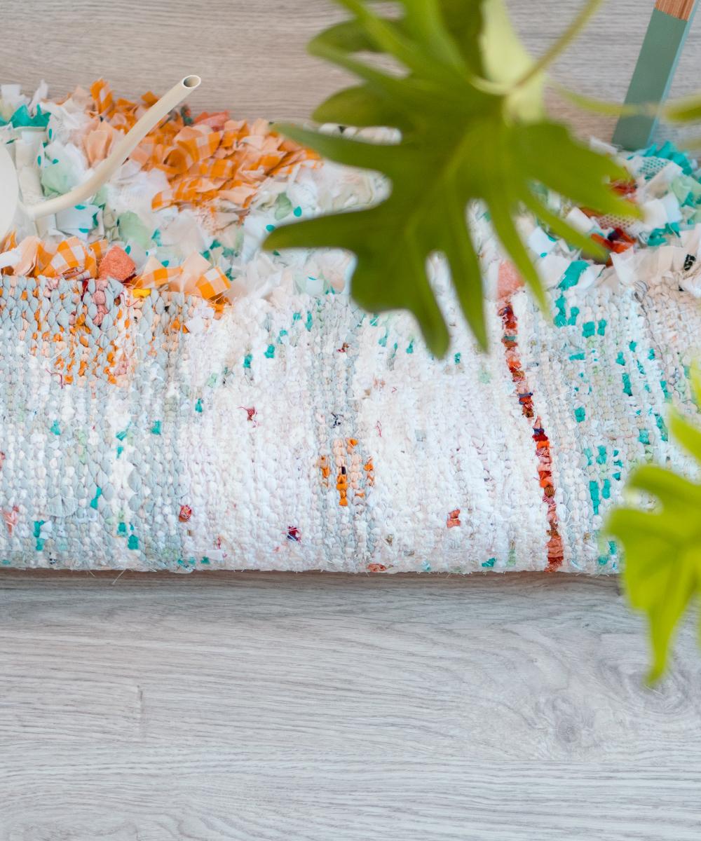 En esta alfombra con retales he metido todo tipo de telas y retales, y hay alguno que se deshilacha. Quiero ver qué tal va el asunto después de pasar por la lavadora. Pero si te animas a crear la tuya y los hilos sueltos te angustian, utiliza telas que no se deshilachen (¡como la de camiseta!)Además yo he usado telas reutilizadas lavadas ya muchas veces. Pero si tú decides hacerla con retales nuevos o trapillo, lávalos primero. Algunas telas varían su tamaño después del primer lavado y además así te puedes ahorrar el disgusto de que alguna destiña.